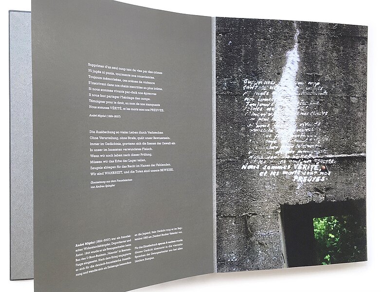 Serien von Leporellos sind in den Tischvitrinen dekoriert: Unikate in freier Farbgestaltung, übermalte Inkjetdrucke und auch die drei zuletzt entstandenen Künstlerbücher, die Heike Ellermann im Eigenverlag als limitierte Auflagendrucke herausgibt. Die aktuelle Arbeit spuren & narben zum Bunker Valentin in Farge/Bremen entsteht 2021. Verknüpft mit dem Gedicht eines französichen Autors und ehemaligen Widerstandskämpfers, der als Zwangsarbeiter am Bunkerbau beteiligt war, ist es ein Beitrag zur Erinnerungskultur in unserer Region.