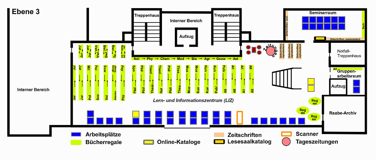 Verschaffen Sie sich einen Überblick über die verschiedenen Räumlichkeiten der Landesbibliothek Oldenburg. Jeder Lageplan zeigt eine Etage.