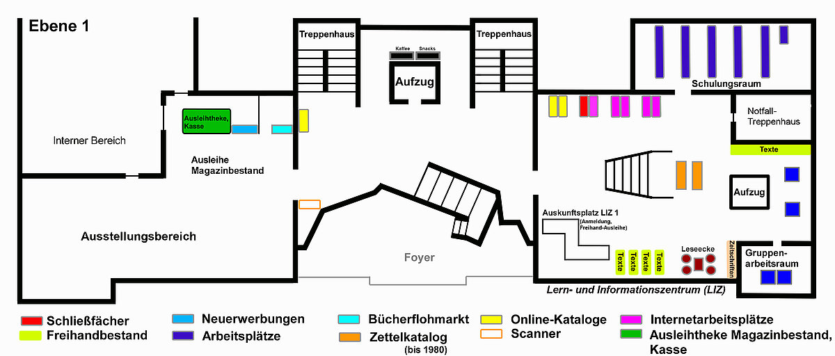 - Lern- und Informationszentrum (LIZ): Zentrale Information und Anmeldung, Freihandbestand, Ausleihe (Freihandbestand), Katalogrechner, Internetarbeitsplätze, rollstuhlgerechte Arbeitsplätze, Zeitschriftenleseecke, Schulungsraum, Gruppenarbeitsraum