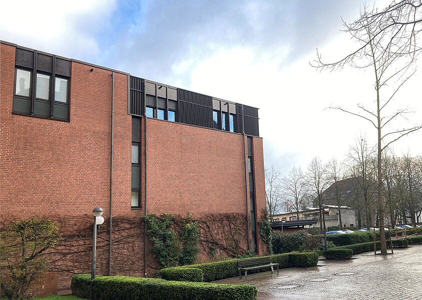 Der Erweiterungsbau wird in Massivbauweise mit Spannbetonhohldielen, Verbundträgern sowie Stahlbetonstützen errichtet. Die Gebäudehülle wurde als hinterlüftete vorgehängte Ziegelfassade geplant. Die Fenster und Außentüren sind aus bronzefarbenen eloxierten Alu-Profilen.