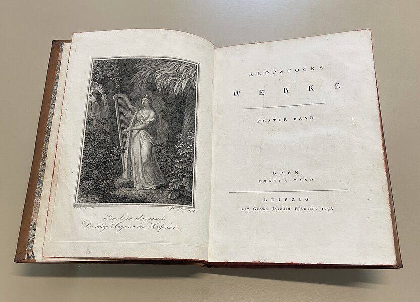 Im Altbestand der Landesbibliothek befinden sich mehrere Werkausgaben und Einzelpublikationen Klopstocks. Anlässlich von Klopstocks 300. Geburtstag ist eine prachtvoll in Leder eingebundene Folio-Ausgabe seiner Werke das Regionalbuch des Monats Mai 2024. Im Lesesaal präsentiert wird der erste Band seiner Odensammlung, die neben seinem Hauptwerk „Der Messias“ als eine seiner wichtigsten Publikationen gilt.